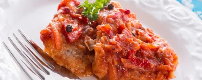 Fisch ist sehr einfach und schnell zubereitet. Beim Schmoren wird Seehecht in Tomatensoße und Gemüse eingeweicht und stellt sich als schmackhaft, zart und saftig heraus.