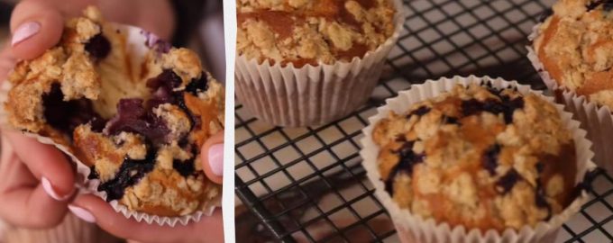 Den Backofen auf 180℃ vorheizen. In eine Schüssel die Eier, den griechischen Joghurt, die geschmolzene Butter, die Milch, den weißen und den braunen Zucker geben. Auf niedriger Stufe schlagen, bis die Masse glatt ist. Das Mehl, Salz und Backpulver hinein sieben. Gründlich weiterrühren, bis alle Zutaten vermischt sind. Vorsichtig die Blaubeeren unterrühren. Den Teig in die Förmchen verteilen. Alle Zutaten für den Streuselbelag mischen. Die Streusel auf dem Teig in jeder Muffinform verteilen. Im Backofen 20-25 Minuten backen.