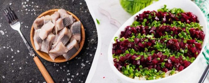 Abgesehen davon, dass dies ein sehr schmackhafter Salat mit Hering und Roter Bete ist, wird er auch so einfach wie möglich zubereitet, was ihn zusätzlich aufwertet. Der Hering sollte in Filets zerlegt werden oder man kann fertige Konserven kaufen. Jedes Stück wird in dünne Scheiben geschnitten, wie bei „Shuba“, und in eine Schüssel gegeben. Dann nimmt man gekochte Rote Bete, schält sie und schneidet sie in mittelgroße Würfel. Dasselbe mit den gekochten Eiern machen. Die grünen Zwiebeln getrennt hacken.