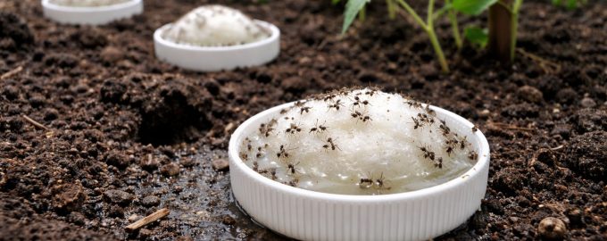 Platzieren Sie die Köder auf Plastikdeckeln in der Nähe der Eingänge zu den Ameisenhaufen.