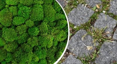 Wie man Moos von Pflastersteinen entfernt / Collage: My, Foto depositphotos.com