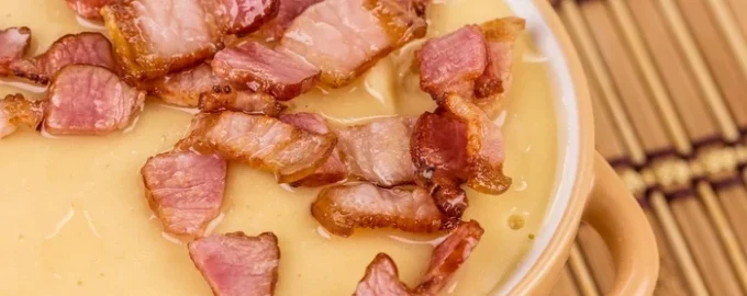 Foto: aus offenen Quellen Bohnensuppe mit geschmolzenem Käse und Speck, sehr schnell und einfach zubereitet, ohne kochende Brühe Das Gericht ist deftig